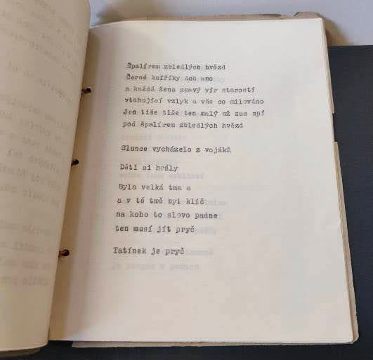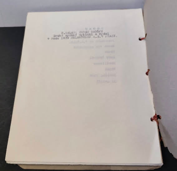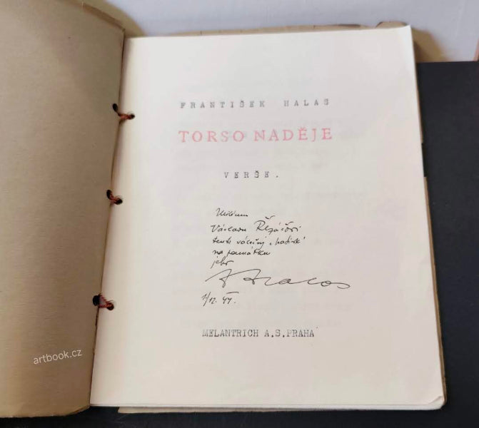 Protektorátní samizdat; podpis autora s datem 14.12. 1944 - Nestr.; 32 listů včetně obálky; strojopis na bílém průklepovém papíře; na titulním listě dedikace: Milému Václavu Řezáčovi tento válečný 'patisk' na památku jeho Fr. Halas; dat. 14. 12. 1944. Strojopisný opis podle 2. vyd. 1939 z Melantrichu (uvedeno v tiráži a na titulu). Volné listy spojené šňůrkou na tři díry. 220x170 Listy strojopisu čisté, nepoškozené, přední i zadní "slepá" pap. ob. otřepená, olámané okraje, ztráty.