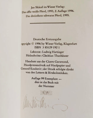 Klagenfurt, Wieser Verlag, 1996.  Text vybrala a z češtiny přeložila Christa Rothmeierová. 33 (7) s., 4 dřevoryty, každý sign. tužkou Christian Thanhäuser. Náklad 99 číslovaných a podepsaných výtisků. Tento exemplář značený "EA" v tiráži tužkou podpis. Šitá brož. na japonský způsob. 245x170 Velmi dobře zachováno.