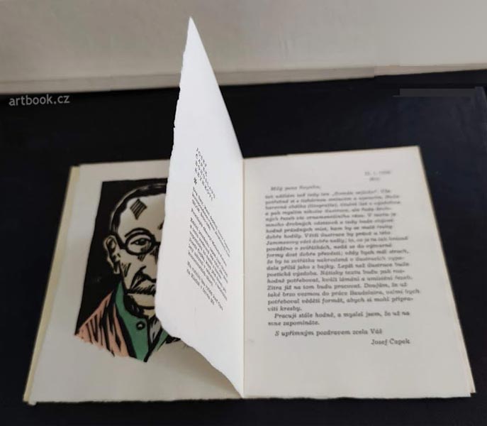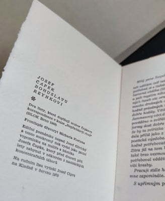 Dva listy, které doplňují soubor Čapkovy korespondence v knize "Nepřicházejí vhod" (Blok, Brno, 1969), ediční poznámku napsal Josef Glivický. Soukromým tiskem vydal Josef Glivický, jako pietní vzpomínku na malíře a básníka Josefa Čapka, který před dvaceti pěti lety zahynul v některém z nacistických koncentračních táborů. Prostějov, Josef Glivický, 1970. Na ruční papír vytiskl Josef Cipra, Kladno. Počet výtisků neuveden (20-30).