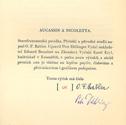 Podpis P. Dillinger a O. F. Babler - Zbraslav, Ed. Beaufort, 1947. 70 s., upravil Petr Dillinger, výt. č. LV., podpis O. F. Bablera a Petra Dillingra, vytiskl Karel Kryl v Kroměříži. Volné dvoulisty v pap. složce. 175x120 Krásný stav. /ate1122/