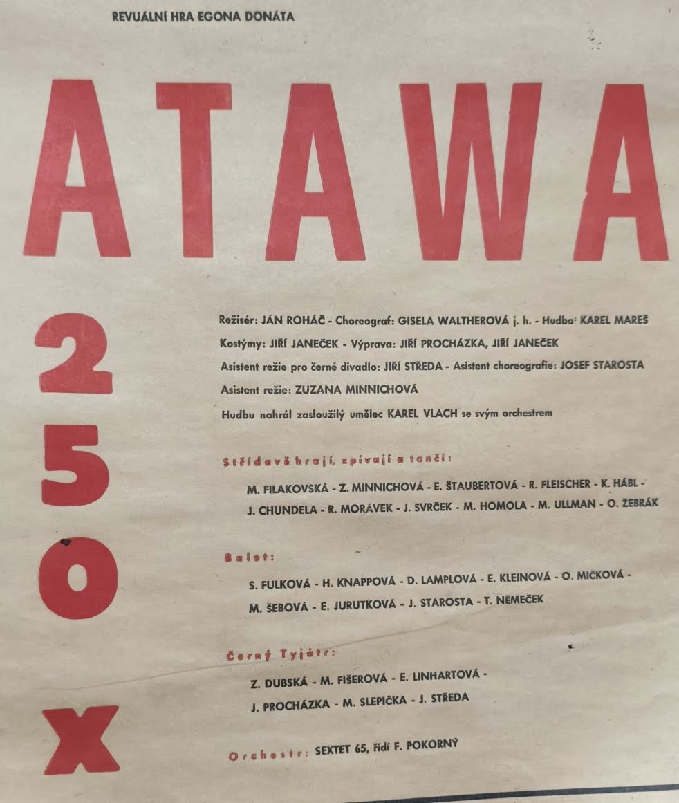 "Atawa". Revuální hra Egona Donáta (=společný pseudonym Miloše Formana a Jana Roháče). Červen 1967. 590x285 /Ate/