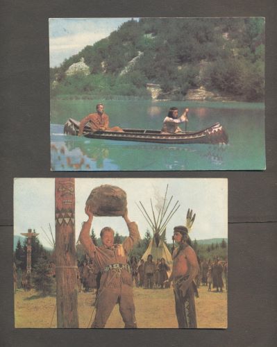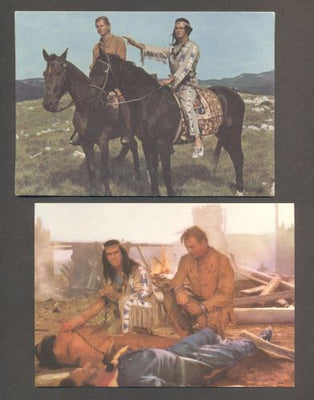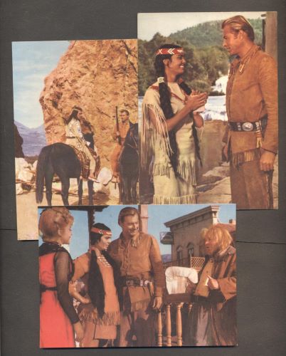 10x Barevná fotografická pohlednice. Praha, ÚPF, Pressfoto. Old Shatterhend - Lex Barker. Vinnetou - Pierre Brice.  Bílá Holubice - Amy Wilkinsová. Sam Hawkens - Ralf Wolter. 105x1845 Krásný stav, nepopsané. /Ate/