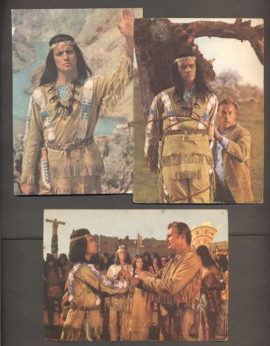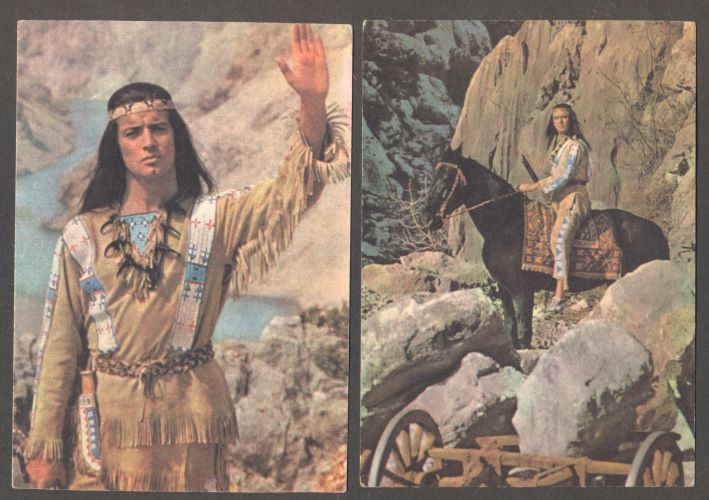 7x Barevná fotografická pohlednice. Praha, ÚPF, Pressfoto. Old Shatterhend - Lex Barker. Vinnetou - Pierre Brice. Nšo-Či - Marie Versiniová. 105x1845 Velmi dobře zachováno, 1 pohlednice popsaná, 1 pohlednice na zadní straně od lepidla. /Ate/