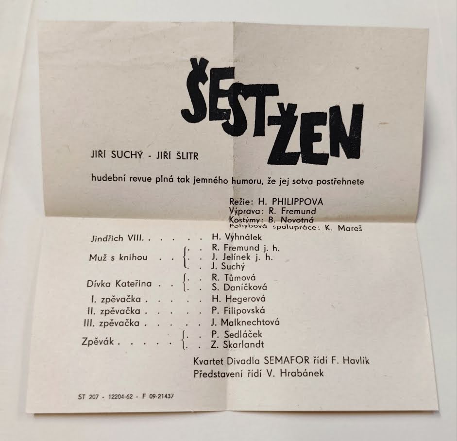 Vloženo: volný list se seznamem autorů a hereckým obsazením hudební revue ŠEST ŽEN.