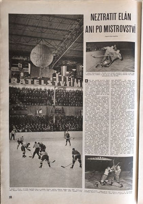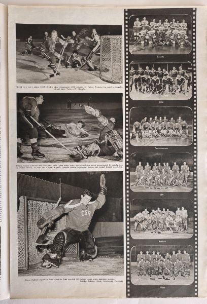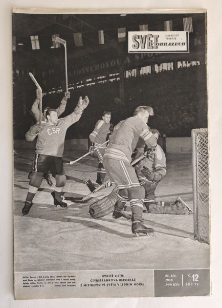 Č. 12., roč. XV. 21. III. 1959. Praha, Orbis, 1959. Hl. redaktor Vladimír Rýpar. 24 s., graf. úprava Vilém Ambrosi, foto z mistrovství světa v ledním hokeji: Rakovec, Kocek, Holubovský, Pardubský, tisk z hloubky. Volný časopis. 450x300 Krásný stav. /ate/
