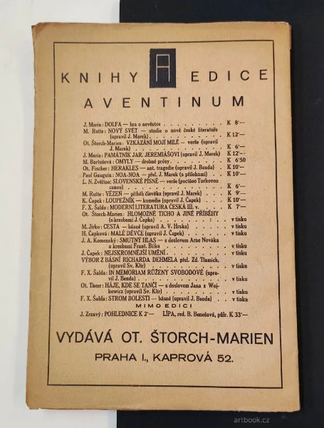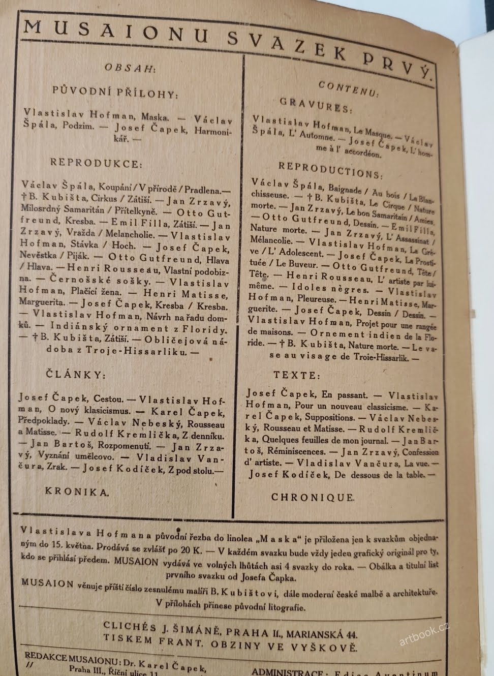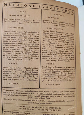 Rediguje Karel Čapek. Praha; Aventinum; 1920. 85 s.; ilustrace v textu; obrazové přílohy na křídě ŠPÁLA; KUBIŠTA; ZRZAVÝ; GUTFREUND; FILLA; VL. HOFMAN; J. ČAPEK, il. v textu. Obálka JOSEF ČAPEK; lino a titulní list JOSEF ČAPEK; lino. Pův. brož. 260x175 Odlomený spodní růžek přední ob.