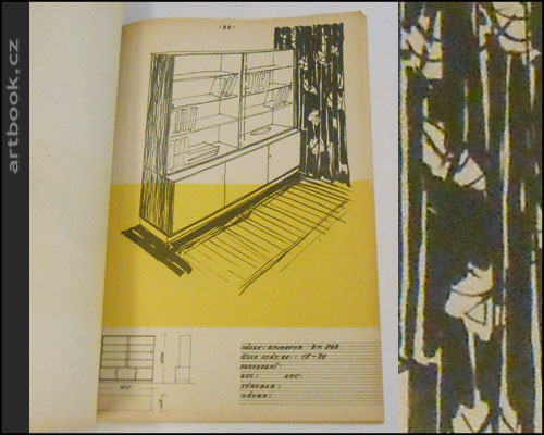 Praha, Institut vývoje a projekce, ÚSVD. 1960. Katalog nábytku, který byl schválen Výtvarnou radou ÚSVD pro výrobu v r. 1961. 30 listů s technickými nákresy jednotlivých kusů nábytku včetně perspektivního zobrazení v interiéru, každý výrobek s popisem (název, výrobce, autor návrhu), ilustrace se žlutým a zeleným podtiskem. Pův. brož. 290x210 Popraskaný hřbet obálky, jinak nepoškozený, čistý exemplář.
