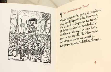 Praha; Novák; 1928. Tisk Státní tiskárna. Knihovna 'Tyršův odkaz' sv. 5. 10 listů; 11 celostránkových ilustrací (zinkografie) JAN KONŮPEK; který každou ilustraci v tomto exempláři signoval; text kaligrafoval OLDŘICH MENHART; dvoubarevný tisk. Ručně čísl. exemplář 44/230 na ručním papíru Van Gelder; celkový počet 380 výt. V tiráži podpis autora a výtvarníka. Pův. polopl. vazba. 320x250