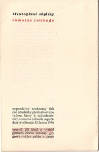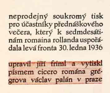 Praha; levá fronta; 1936. Vytiskl písmem cicero romána Václav Palán v Praze. 12 s.; typo JIŘÍ FRIML; dvoubarevný tisk. Volné složky. 200X125 ...neprodejný soukromý tisk pro účastníky přednáškového večera; který k sedmdesátinám romaina rollanda uspořádala levá fronta 30 ledna 1936. Tiráž a titulní list tištěny důsledně malými písmeny; v textu konvence zachovány.