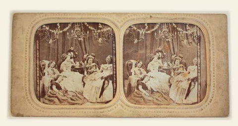 Albuminový fotografický papír s podmalbou a vpichy je uložen ve výřezech kartonu; okraje výřezů jsou zdobeny tlačeným ornamentem. Karton 85x175; výřezy 67x67 Ukázka nejstaršího typu stereofotografie a vizuální hry; přinášející průhledem přes výřezy proti světlu a pomocí vpichů a podmalby rozmanité světelné iluze a zážitky.