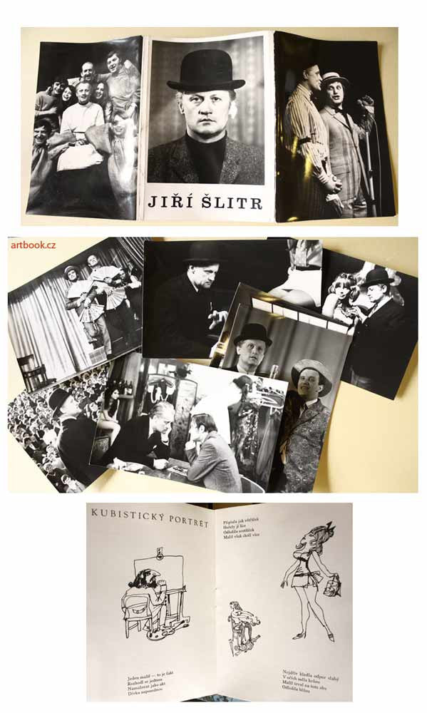 12 fotografií Jiřího Šlitra - Praha; Pressfoto; nedat. (1970?). 8 s. textu (J. Suchý: Kubistický portrét); kresby J. Šlitr a 12 bromografií (IVAN ENGLICH; Z. ŠKARVANOVÁ; M. ČÁLEK; M. MIRVALD ad.). Volné listy v pův. fotografické obálce. 180x120 - Na obálce odloupnutý kousek J. Šlitra (ucho).