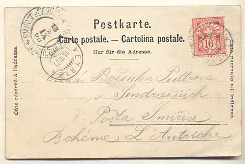Pohlednice. 1900. Švýcarsko. Dlouhá adresa. Prošlá poštou; známka; razítko; popsaná. Dobrý stav.
