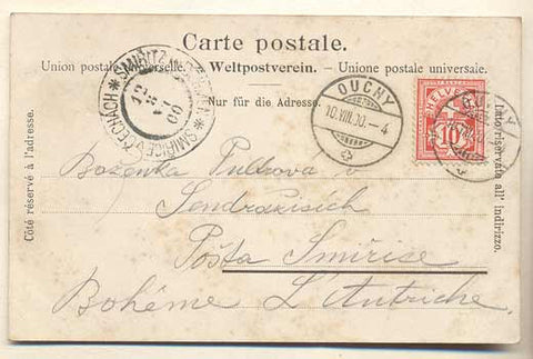 Pohlednice. 1900. Ženeva - parník. Dlouhá adresa. Prošlá poštou; známka; razítko; popsaná. Nepatrné světlehnědé skvrny. Dobrý stav.