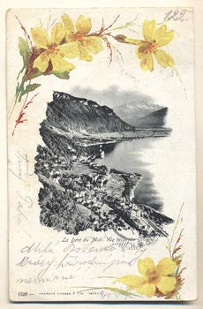 Pohlednice. 1900. Švýcarsko. Dlouhá adresa. Prošlá poštou; razítko; popsaná. Na zadní straně nepatrné světlé skvrny. Dobrý stav.