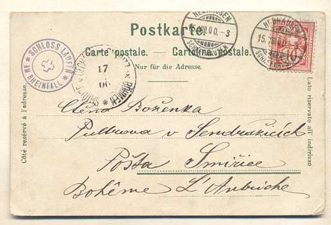 Pohlednice. 1900. Švýcarsko. Dlouhá adresa. Prošlá poštou; známka; razítko; popsaná. Dobrý stav.