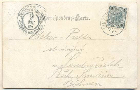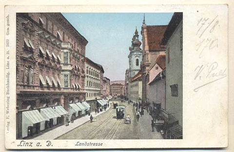 Pohlednice. 1900. Linz - pohled na ulici. Rakousko. Dlouhá adresa. Prošlá poštou; známka; razítko; popsaná. Dobrý stav.