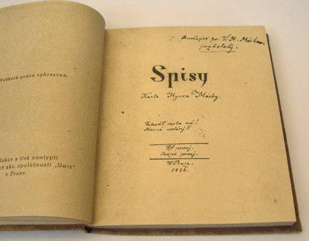 Neotypický facsimil původního rukopisu básně 'Máj' od Karla Hynka Máchy z roku 1836. Praha; Šimáček; 1916. (84) s. Pův. pap. vazba. 135x110Věrný snímek původního rukopisu básně 'Máj' od Karla Hynka Máchy z r. 1836.