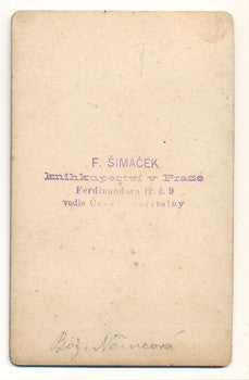 Božena Němcová; spisovatelka (1820 - 1862). Vizitka; fotografie na kartonu. Z rubu razítko prodejce: F. Šimáček knihkupectví v Praze. 108x68 - Originální dobová fotografie 19 st. (fotografie J. Malocha - neoznačeno; nedat.)