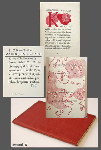 Picka - Z revue The Bookman's Journal přeložil O.F. Babler. V Praze; Jaroslav Picka; 1933. 30 s.; dřevoryty (2 celostr.; titulní list; iniciála) vyzdobil A. BURKA. Náklad 53 výtisků; tento exemplář s číslem 37 na ručním papíře Pannekoek; podpis A. Burky pod tiráži. Volné složky v pův. pap. obálce. 155x105