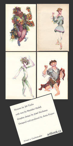 With text by Břetislav Hodek. Prague; Artia; 1959. Nestr.; (16) s. včetně obálky; 4 celostr. bar. ilustrace a il. na obálce JIŘÍ TRNKA. Volné složky v pův. pap. obálce. 280x185 - Anglická verze novoročního tisku Básník a malíř.
