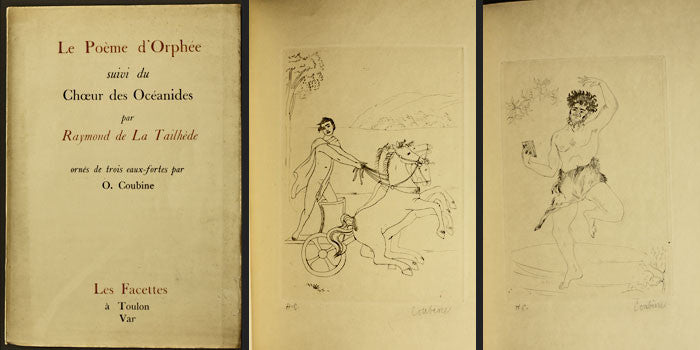 SUIVI DU CHOEUR DES OCEANIDES. Toulon; Les Facettes; Francois Bernouard; 1926. Nestr. (34) s. včetně obálky; tři celostr. orig. suché jehly OTAKAR KUBÍN (vše sign.). Vydáno celkem 100 číslovaných exemplářů; tento výtisk mimo čísl. řadu O. Kubínem podepsaný a značený H.C. (pro spolupracovníky). Pův. brož. 280x195
