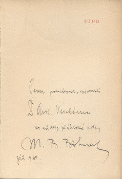 Praha; Sfinx; Janda; 1930. 'Nové cíle'. 248 s.; obálka a kresba v titulu A. V. HRSTKA; úprava F. J. MÜLLER; dedikace a podpis autora; datováno září 1930. Pův. brož. 205x140 /H/