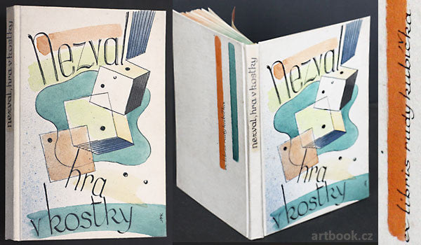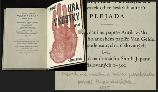 NEZVAL; VÍTĚZSLAV: HRA V KOSTKY. Básně 1927 a 1928. Praha; Škeřík; 1928. 138 s.; obálka (s otiskem básníkovy levé ruky) JINDŘICH ŠTYRSKÝ. Umělecká papírová vazba s barevnou kresbou na přední desce (sign.); barvená vrchní ořízka; obálka vzadu vevázána. Velmi dobře zachováno.
