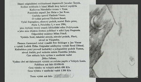 Praha; Lyra Pragensis; 1986. Edice Polyhymnia; sv. 4. 61 s.; 10 signovaných mědirytin JAROSLAV ŠERÝCH. Písmem Garamond ručně vysadili Petr Sichinger a Jan Viener; dvoubarevně vytiskl Ludvík Žižka; originální mědirytiny vytiskl Pavel Dřímal. Celkem tištěno 200 čísl. exemplářů; tento výtisk na losínském ručním pap. autorský. Pův. brož. 300x220