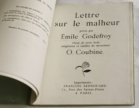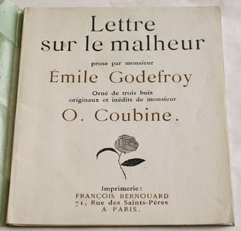 Coubine - GODEFROY; ÉMILE: LETTRE SUR LE MALHEUR. - 1919. Paris; Bernouard. Dřevoryty OTAKAR KUBÍN.