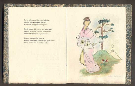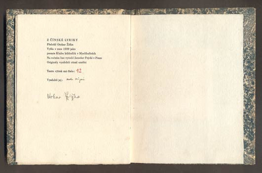 Podpis - Myslibořice; Klub bibliofilů; 1939. Přeložil Otokar Žižka. (18) s.; ex. č. 12; na ručním lise vytiskl Jaroslav Pejchl v Praze; originály vyzdobili různí umělci; tento MARTA HRŮZOVÁ (ručně kolorované); v tiráži podpis O. Žižky a M. Hrůzové. Pův. pap. vazba. 160x125