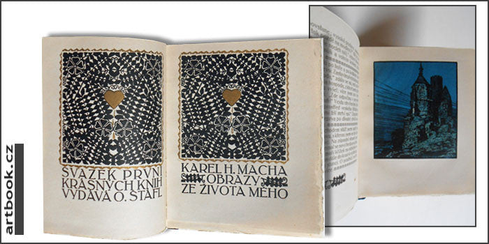 Praha; O. Štáfl; (1911). Krásné knihy sv. 1. Doslov Julia Schmitta. 68 s.; úprava a dřevoryty OTOKAR ŠTÁFL (4 obr. příl.); ex. č. 177. Pův. měkká vazba; desky potažené moiré hedvábím; zlacená ražba na přední desce; zlatá horní ořízka. Hřbet; vlivem světla; vybledlý. 145x115 - Chráněno přebalem transparentní folie.