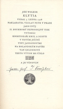 Praha; Václav Petr; II. soukromý neprodejný tisk; 3. ledna 1928. 69 s.; ex. č. 126 věnován prof. J. Konůpkovi; vytiskli Kryl a Scotti v Novém Jičíně na holandském papíře Van Gelderově. Pův. brož.180x115 Velmi dobře zachováno. /Ate/