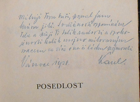 Tento exemplář je na patitulu opatřen pozoruhodným věnováním; psáným perem s modrým inkoustem: 'Miluji Tvou duši; poznal jsem krásu žití. S vděčností vzpomínám Tebe a přeji Ti tolik radosti a spokojenosti kolik možno milovaným srdcem ve víře v naší lásku pojmouti.