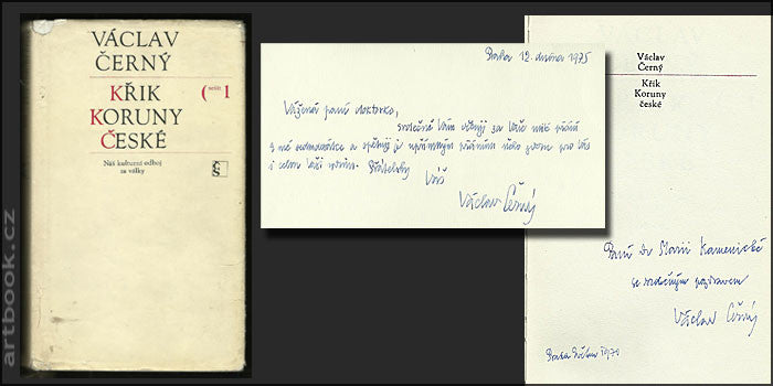 V vobě vydání kniha zabavena; pár desítek výtisků zachránili zaměstnanci tiskárny. Tento exemplář s věnováním a podpisem Václava Černého; dat. Květen; 1970. V knize přiložen volný list s rukopisným poděkováním a podpisem; dat. 12.dubna 1975 'za Vaše milé přání k mé sedmdesátce'.