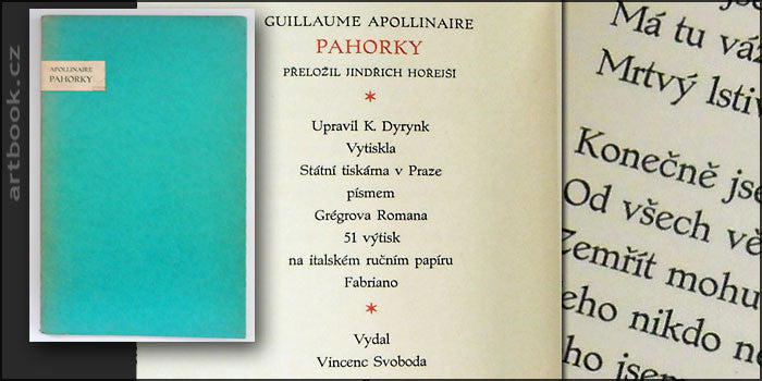 Upravil Karel Dyrynk; tisk Státní tiskárna v Praze; pouze 51 výtisků!Překlad Jindřich Hořejší. Praha; Vincenc Svoboda; 1931. Na italském ručním papíru Fabriano; písmem Grégrova Romana vytiskla Státní tiskárna v Praze v počtu 51 výtisků; typograficky upravil KAREL DYRYNK. Dvoubarevný tisk (tit. l.; tiráž; iniciála). Pův. šitá brož; pap. štítek s autorem a názvem díla. 195x125
