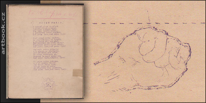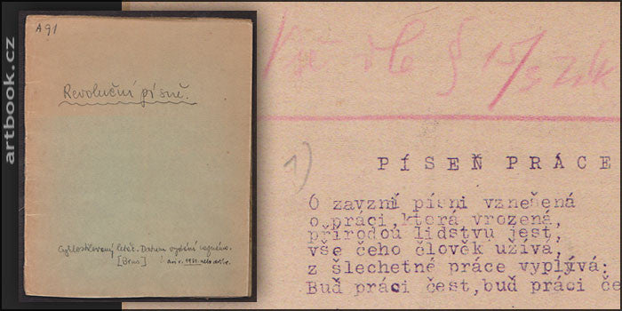 Ilegální tisk - Agitační leták komunistické mládeže z 1. republiky.Cyklostyl. Nedatováno; kol. r. 1930. [Brno ?]. (28) s. 35 textů písní (mj. Bože; když jsem byl policajtem; Klerikální děvče; Pochod modré bluzy; Je v nebezpečí stát; Pochod komunistů) z nich 4 německy; 2 rusky a 2 španělsky. Vedle písní rozmanitá agitační hesla: 'Budujte mladou obranu; Vstup do komunistické mládeže; Proti fašismu dělnická pěst; apod. Ilustrováno drobnými kresbami (hvězda; srp a kladivo; sevřená pěst ...). Pův. dvoulisty spojené nití; nasazeny do dodatečné dobové pap. obálky na níž registrační čísla; ručně psaný název 'Revoluční písně' a stejným písmem základní popis. 210x170