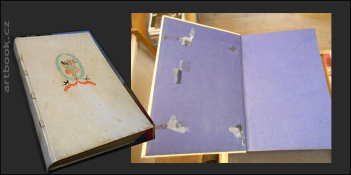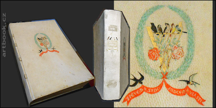 Praha; Alois Hynek; (1886). Nové vydání. 607 s.; 204 s. notová příloha nápěvů. Pergamenová vazba zdobená barevnou orig. kresbou na přední desce; zlaté ořízky. 245x170 Na předsádkách stopy od izolepy; kterou si předchozí majitel upevnil vlastní ochranný přebal na knihu (vix druhý obr.).