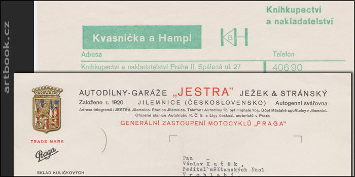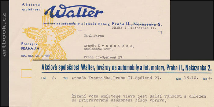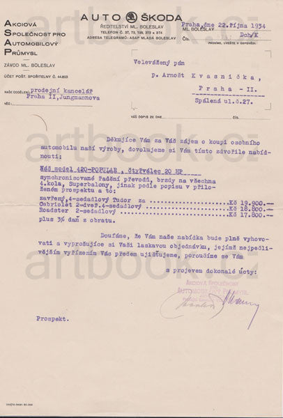 Cenové nabídky na firemních tiskopisech (3x A4; r. 1934) + tiskopis zástupce firmy Praga s omluvou za odklad návštěvy s předváděcím vozem; 1934 + tiskopis nakladatele Arnošta Kvasničky; kde svému příteli doporučuje Tatru 75 nebo Super Picolu a pomoc při vyjednání 'slušné slevy'; r. 1934. 5 volných listů.