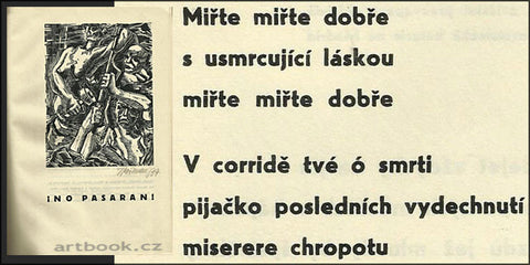 Soukromý tisk. Josef Bořil; Kukleny; v březnu 1937. (20) s. Text: Zdeněk Nejedlý: Předmluva.; Helena Malířová: La Passionaria.; Vít. Nezval: Dvanáct novoročních výstřelů.; Fr. Halas: Miřte.; S.K. Neumann: Španělské dni.; František Halas: Don Quijote bojující. Grafická úprava a 2 orig. sign. dřev Josef Heřman; 1 celostr. orig. linoryt Vinc. Walter. Čísl. ex 447 z 350 výtisků na pap. Dokument; mimo to bylo ještě vytištěno 150 ex. na ruč. pap. Zanders s podpisy autorů. Pův. celopl. vazba. 290x200