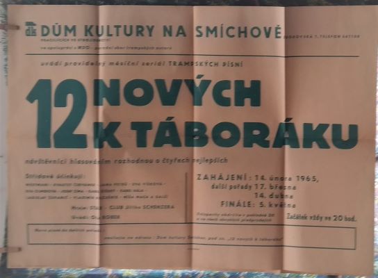 Plakát. Pravidelný měsíční seriál trampských písní. Dům kultury na Smíchově, zahájení 14. února 1965. 610x850 Podélně a napříč přeloženo. /ATE/