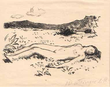 Akt ležící dívky. 115x150. Litografie; signovaná tužkou. Ruční papír (265x205) se slepotiskovým razítkem Arthura Nováka.
