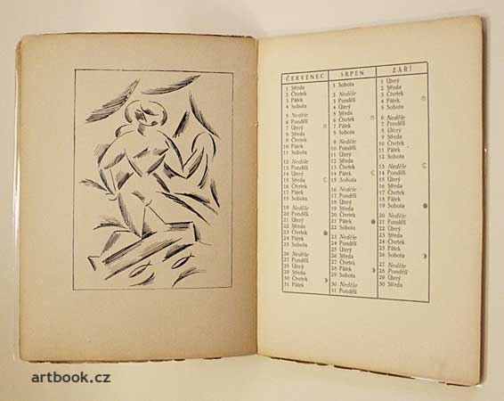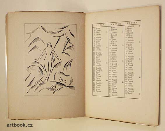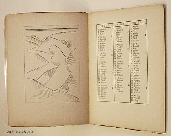 Praha; nákladem Tiskového družstva 'Přehled'; 1913. Vytiskla Grafie; Dělnická knihtiskárna v Praze. Vydali Josef Čapek; Karel Čapek; Otokar Fischer; Stanislav Hanuš; Vlastislav Hofman; Josef Kodíček; Stanislav K. Neumann; Arne Novák; Václav Špála; Václav Štěpán; Otakar Theer; Jan z Wojkowicz. Kresby VÁCLAV ŠPÁLA; úprava V. H. BRUNNER. 80 s.; 15 básní; 3 eseje; 3 drobné prózy a kalendárium se čtyřmi celostr kubistickými kresbami (Zima; Jaro; Léto; Podzim) Václava Špály. Pův. šitá brož. 245x185 Obálka popraskaná, bez hřbetu, stav obálky stabilizovaný přebalem z transparentní fólie. šitý blok volnější, listy nepoškozené.