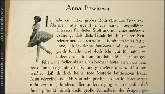 Berlin, Bruno Cassirer 1913. 43 s., texty Oscar Bie, Paul Barchan, Max Osborn a Anna Pawlowa, ilustrace Leo Baxt, Robert Leonard, Ernst Oppler, Ceroff, Claire Avery, 6 celostr. fotografií a četné fotogr. viněty. Pův. kartonová vazba s kresbou na přední desce Maxe Slevogta, která vlivem použité technologie již téměř zmizela, stejně jako u všech exemplářů, které se ve světě dají vidět. Kniha nepoškozená, v krásném stavu! /balet/tanec/