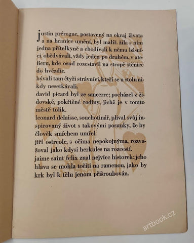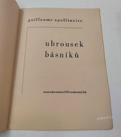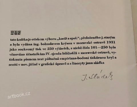 Moravská Ostrava, B. Krýsa, 1931. Nestr., 8 listů, linoryty a grafická úprava Jan Sládek, jeho podpis v tiráži. Věnováno účastníkům IV. sjezdu bibliofilů v Moravské Ostravě. Vytiskl Kryl a Scotti v Novém Jičíně, ex. 242/250. Pův. šitá brož. 280x210