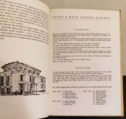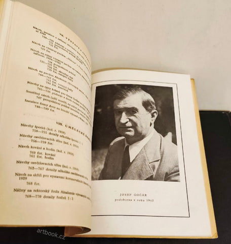 Výstava životního díla. SVU Mánes, červen, 1947. Nestr. (40) s textu, obsahuje životopisná data, zahraniční cesty, literaturu o díle J. Gočára, seznam absolventů Mistrovské školy J. Gočára (mj. Karel Lodr 1938-1939), seznam členů kanceláře J. Gočára (mj. Karel Lodr 1939-1944), rozsáhlý soupis vystavených prací celoživotního díla - náčrty, modely, fotografie budov, (16) s. obr. příloh na křídě. Pův. brož. 210x150 + dva novinové výstřižky. Velmi dobře zachováno!