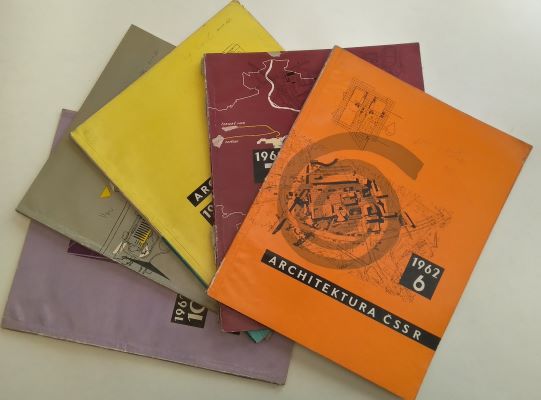 Praha, Svaz architektů ČSSR, 1962. Šéfredaktor Oldřich Starý. 339 s., mj. obsahuje: Administrativní budova Strojimportu; Bytová výstavba v Praze; Poruba po deseti letech; Nová ostravská města ... 5 sešitů. 310x240 Dva sešity na hřbetě poškozeny, jinak dobře zachováno. /H/