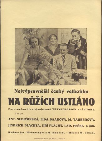 Plakát - Nejvýpravnější český velkofilm "Na růžích ustláno". 1934. Režie: M. Cikán. Hrají: Jindřich Plachta, Antonie Nedošinská, Maria Tauberová, Lída Baarová ... 300x210 Velmi dobře zachováno.