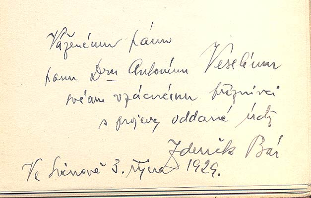 Podpis autora - Verše. Vyškov na Moravě, F. Obzina, 1929. 47 s., dedikace s podpisem autora, dat. 3. října 1929. Pův. brož. 200x125 /H/