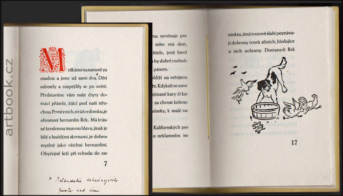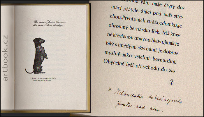 Na úvodní str., pod fotografií jezevčíka, motto: "Čím více poznávám lidi, tím více miluji psy". Angl. originál v horní části strany.
