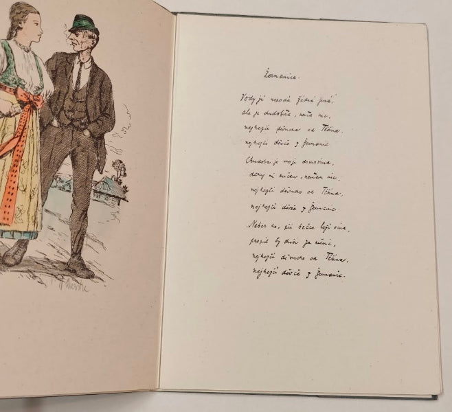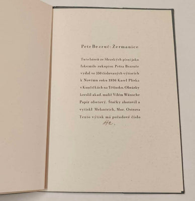 Kunčičky, Pliska, 1935. (8) s., faksimile rukopisu s vlastnoručním podpisem autora na titl., 2 celostr. bar. il. Vilém Wünsche (obě sign.!), ex. 112/150. Volné dvoulisty v pap. složce.
